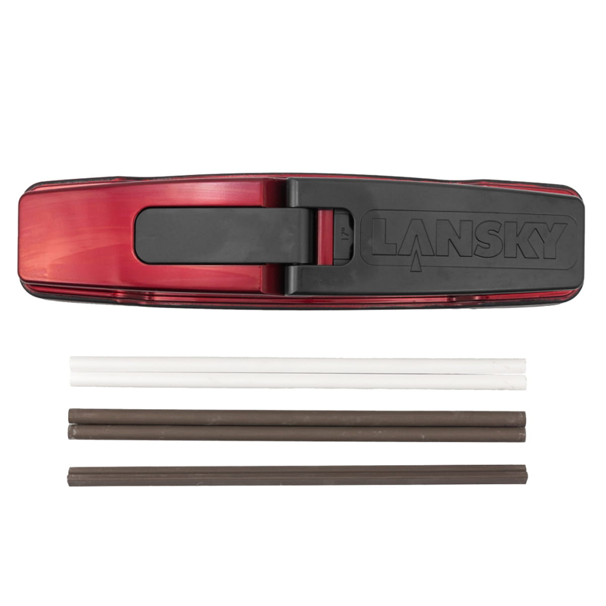 Ostrzałka Lansky Masters Edge Deluxe posiada trzy najczęściej stosowane kąty ostrzenia: 17º, 20º i 25º, dzięki czemu za jej pomocą w prosty i szybki sposób można naostrzyć praktycznie każdy typ ostrzy gładkich i ząbkowanych, od noży myśliwskich, przez użytkowe, na nożach kuchennych kończąc. W zestawie znajdują się dwa pręty o średniej twardości (szare) oraz dwa pręty ceramiczne (białe), które pozwalają na ostrzenie i precyzyjne wyprowadzenie krawędzi tnących. Dodatkowo w zestawie znajduje się kamień ceramiczny o trójkątnym przekroju, który służy do ostrzenia wszelkiego rodzaju ostrzy ząbkowanych jak również przebijaków, szydeł oraz haczyków wędkarskich. Lansky Masters Edge Deluxe posiada gumową antypoślizgową podstawę poprawiającą stabilność i zintegrowaną osłonę dłoni zapewniającą bezpieczeństwo w trakcie ostrzenia. W podstawie umieszczone są uchwyty do przechowywania prętów.