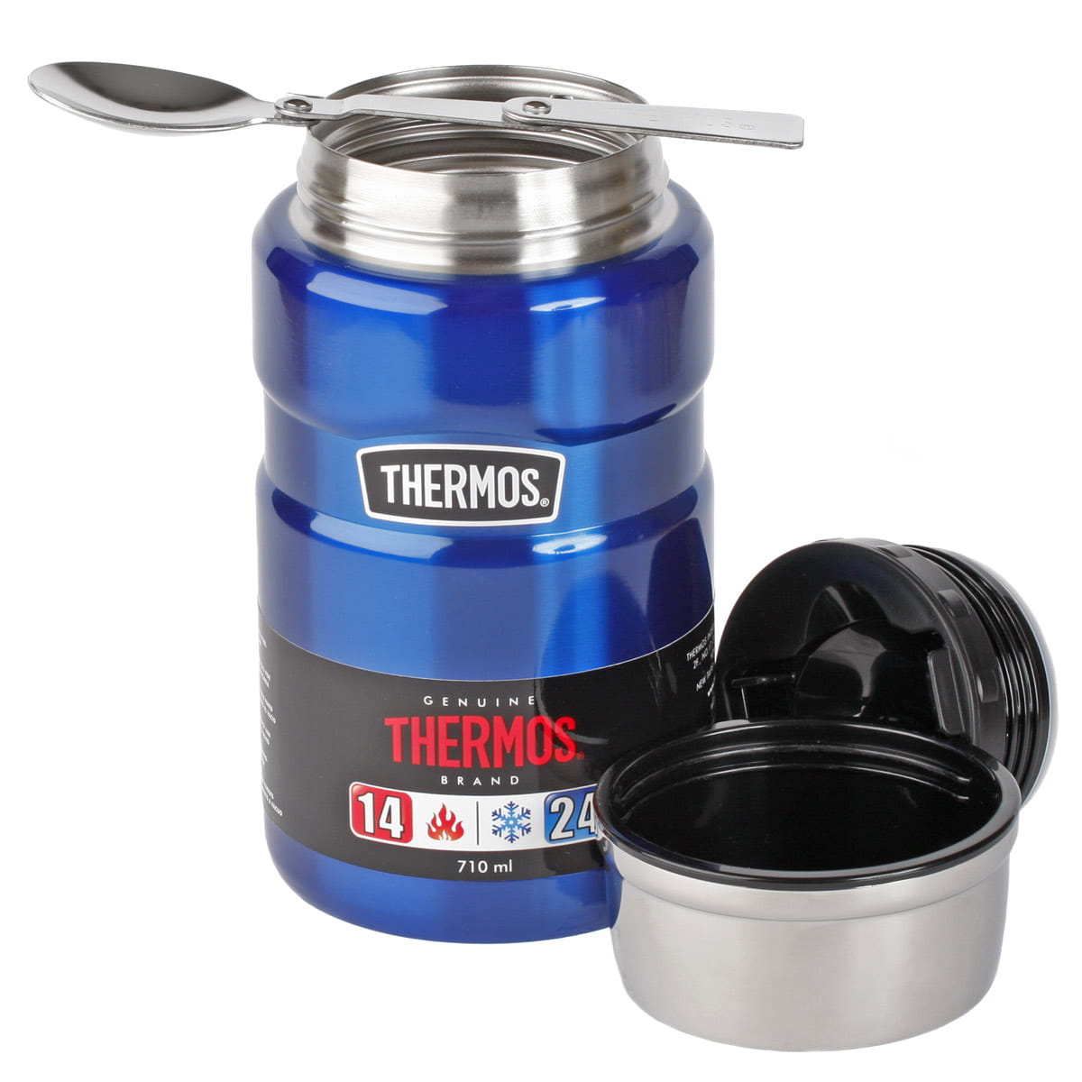 THERMOS King Food Jar 710ml posiada szeroki wlot ułatwiający napełnianie i opróżnianie termosu, jak również umożliwia jedzenie bezpośrednio z pojemnika. Kompaktowa, izolowana przykrywka termosu może być wykorzystywana jako miska. Gładkie, stalowe powierzchnie pozwalają łatwo wyczyścić wnętrze termosu. W zestawie znajduje się umieszczona w nakrętce pełnowymiarowa, składana łyżeczka wykonana ze stali nierdzewnej ułatwiająca spożywanie posiłków.