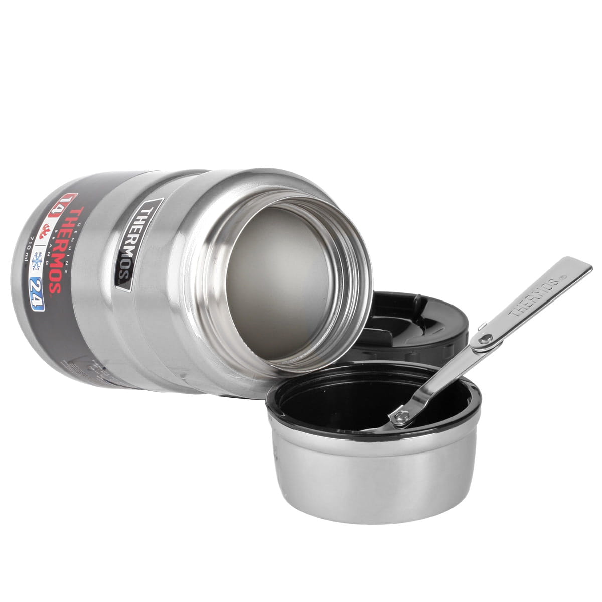 THERMOS King Food Jar 710ml posiada szeroki wlot ułatwiający napełnianie i opróżnianie termosu, jak również umożliwia jedzenie bezpośrednio z pojemnika. Kompaktowa, izolowana przykrywka termosu może być wykorzystywana jako miska. Gładkie, stalowe powierzchnie pozwalają łatwo wyczyścić wnętrze termosu. W zestawie znajduje się umieszczona w nakrętce pełnowymiarowa, składana łyżeczka wykonana ze stali nierdzewnej ułatwiająca spożywanie posiłków.