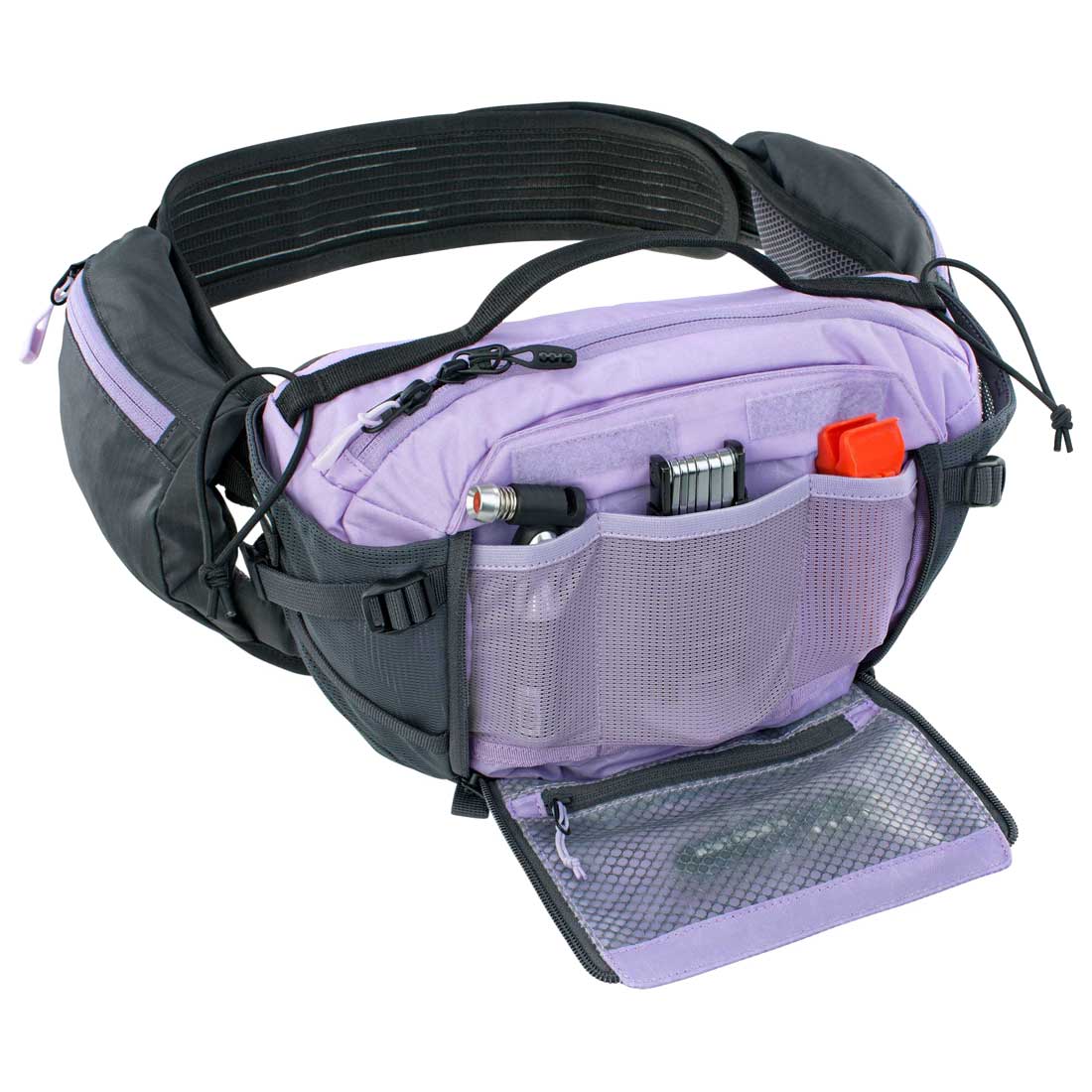 Biodrówka Evoc Hip Pack Pro 3L podobnie jak w modelu Hip Pack 3L, po obu stronach pasa biodrowego znajdują się zapinane na zamek kieszonki. W przedniej kieszeni zapinanej na zamek znajdziemy małe kieszonki przydatne do rozlokowania narzędzi i innych rowerowych szpargałów.