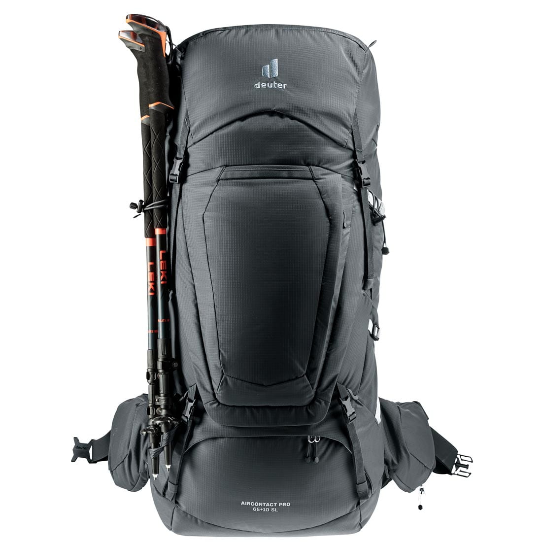 Deuter Aircontact Pro 65+10 SL plecak posiada dwie komory z możliwością połączenia i trzy sposoby dostępu do nich. Takie rozwiązanie znacznie ułatwia pakowanie i umożliwia zachowanie ładu w spakowanym ekwipunku. Dostęp do komory głównej odbywa się klasycznie od góry lub poprzez umieszczone na froncie plecaka dojście w kształcie litery "U" z szerokim zamkiem błyskawicznym. W jej wnętrzu znajduje się przegroda na bukłak, która może służyć również za „mokrą kieszeń”. Mniejsza dolna komora zabezpieczona za pomocą suwaka jest odpowiedniej wielkości aby pomieścić np. śpiwór. W podstawie plecak ma pojemność 65 litrów, która może być zwiększona o kolejne 10 litrów dzięki ekspanderowi w kominie. Plecak posiada odpinaną górną klapę z dwoma kieszeniami i nadrukowanym panelem SOS. Dzięki dołączonym do zestawu paskom można ją przeistoczyć w użyteczny plecaczek typu "daypack". Dwie boczne kieszenie skrzelowe i kieszeń na froncie zapewniają miejsce na dodatkowe akcesoria. Po bokach ulokowano dwie elastyczne kieszenie na butelki z wodą lub bidony. Posiada również dwie kieszenie na pasie biodrowym. Są one odpinane, więc w razie potrzeby szybko je zdemontujesz. Jedna z nich może służyć jako miejsce na butelkę 1,5 litra. Umieszczone bo bokach i w dolnej części plecaka paski kompresyjne służą do stabilizacji jego zawartości lub do przytoczenia dodatkowego osprzętu. Plecak ma też uchwyty na czekany i kijki trekkingowe. Zintegrowany pokrowiec przeciwdeszczowy zabezpiecza plecak i jego zawartość przed niekorzystnymi warunkami atmosferycznymi.