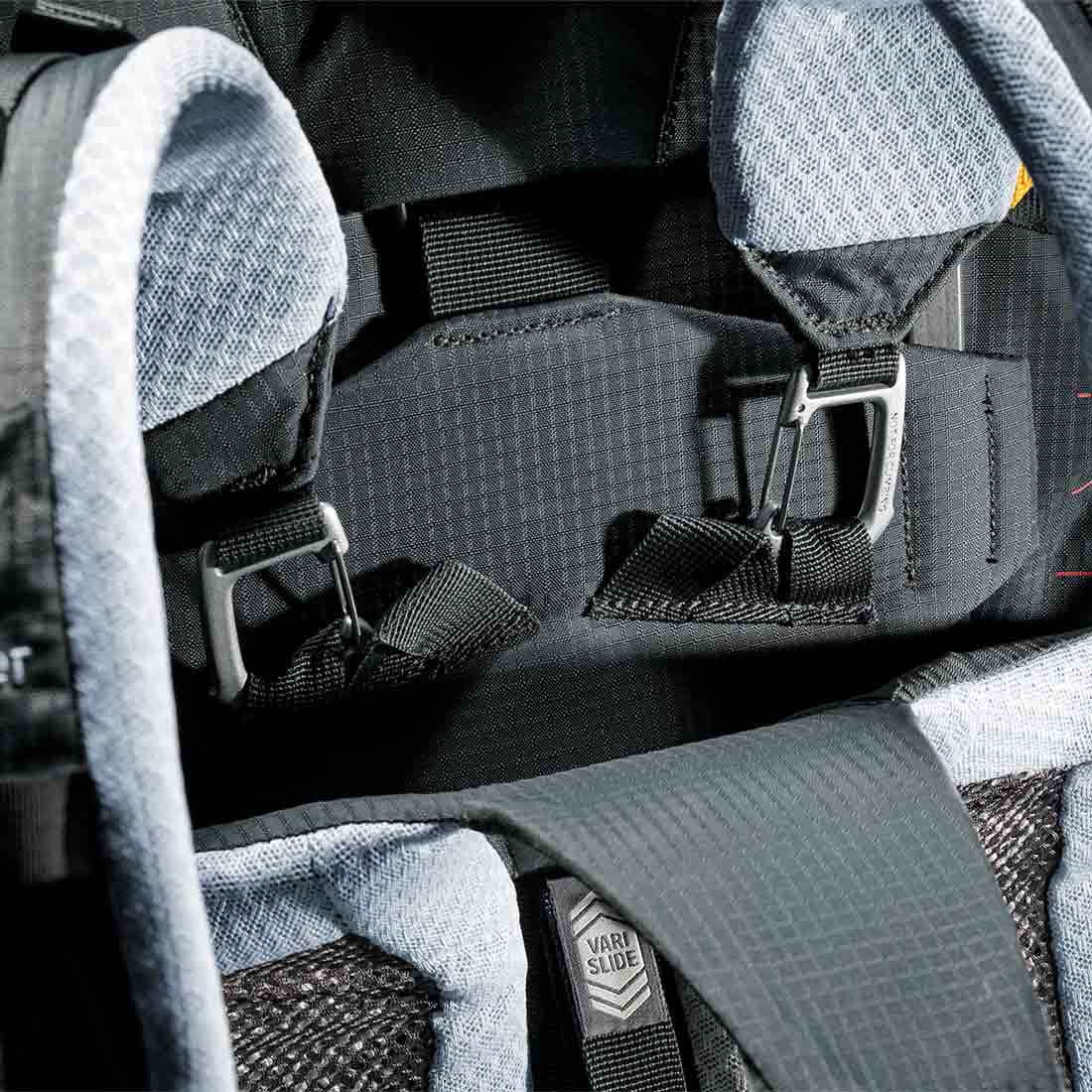 Deuter Aircontact Pro 65+10 SL posiada zaawansowany system nośny Aircontact, który zapewnia wysoki poziom komfortu nawet przy dużych obciążeniach. W wersji SL została zmodyfikowany zgodnie z anatomiczną budową ciała kobiety Women's Slim Fit. Skrócono cały system nośny, wyprofilowano pasy nośne i zmniejszono ich rozstawienie względem siebie. Z uwagi na różnice w położeniu miednicy i kości biodrowych zmieniono również kąt przylegania pasa biodrowego. Płynna regulacja VariSlide umożliwi precyzyjne dopasowanie długości systemu nośnego sylwetki i wzrostu. Stelaż w kształcie litery "Y" wykonany z aluminium przenosi 70% obciążenia z pleców oraz ramion na pas biodrowy i lędźwiowy odcinek kręgosłupa. Wahadłowy pas biodrowy VariFlex ECL (Ergonomic Comfort Lock) zintegrowany z ramą plecaka wyposażono w dodatkowe poduchy, które umożliwiają lepsze przyleganie oraz skuteczniejsze przenoszenie ciężaru. Dodatkowo w wersji damskiej jest on odpowiednio sprofilowany. System zapięcia pasa biodrowego Pull-Forward, poprzez ściągnięcie troków przed sobą, wymaga zdecydowanie mniej siły oraz poprawia precyzję jego dopasowania. Panel tylny posiada umieszczony centralnie kanał wentylacyjny zapobiegający przegrzewaniu się pleców. Poduszki panelu wykonane są z pianki o otwartych komórkach i pokryte zostały oddychającą tkaniną Air Spacer. Zapewniają dzięki temu komfort i wentylację. Ruchome, ergonomiczne szelki uprzęży ActiveFit z regulowanym paskiem piersiowym, pozwalają na swobodne dopasowanie plecaka.