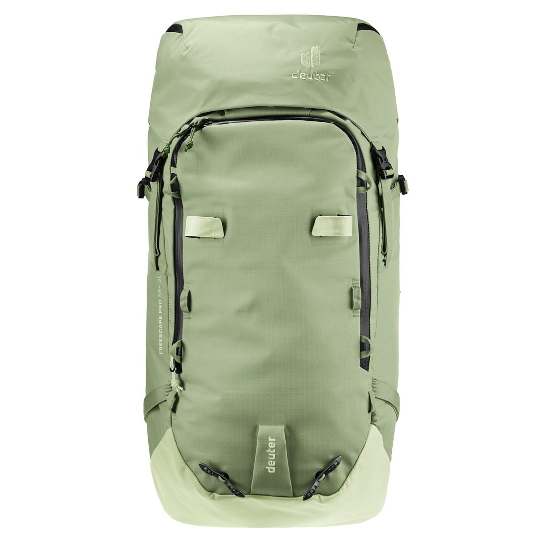 Deuter Freescape Pro 38+ SL to jednokomorowa konstrukcja o pojemności 38 litrów, którą można powiększyć o kolejne 10 litrów za pomocą ekspandera w kominie. Dojście do obszernej komory głównej może być realizowane na dwa sposoby, klasycznie od góry poprzez klapę z regulowaną wysokością, lub umieszczony od strony pleców dodatkowy dostęp zabezpieczony zamkiem błyskawicznym, co jest przydatnym rozwiązaniem gdy do plecaka przytroczony jest osprzęt. Wewnątrz komory znajduje się siatkowa kieszeń i przegroda dedykowana na bukłak o maksymalnej pojemności 3 litrów (bukłak sprzedawany osobno). Klapa zabezpieczająca górne dojście wyposażoną jest w dwie kieszenie (zewnętrzną i wewnętrzną), pod nią znajduje się pasek do troczenia liny. Od frontu znajduje się kieszeń na podręczne akcesoria w której umieszczono uchwyt na kask i obszerna kieszeń na lawinowe ABC (sonda + składana łopata) z nadrukowanym panelem SOS. Plecak posiada uchwyty do troczenia nart klasycznie (A-Skifix), a dołączone paski umożliwiają troczenie diagonalnie (D-Skifix) i mocowanie snowboardu lub rakiet śnieżnych. Użytkownik może również do niego przytroczyć czekany, kijki i inny sprzęt zimowy. Dodatkowo z boku posiada kieszonkę na smartfona i umieszczone na pasie biodrowym kieszonkę zapinaną na suwak oraz szpejarkę. Wszystkie suwaki zewnętrzne zakończone są pętelkami, które ułatwiają ich otwarcie nawet w grubych rękawicach narciarskich.