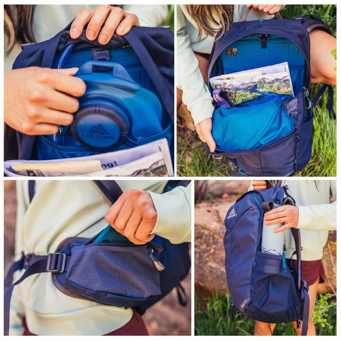 Dodatkowo Damski plecak turystyczny Gregory Jade LT 20 posiada jedną, niedużą kieszeń na froncie plecaka. Zmieszczą się tam klucze, telefon i pokrowiec przeciwdeszczowy. Po bokach plecaka znajdują się dwie obszerne elastyczne kieszenie, w które z łatwością zmieści się bidon, kubek termiczny lub butelka z wodą. Dodatkowo ich zawartość można zabezpieczyć paskami kompresyjnymi.
