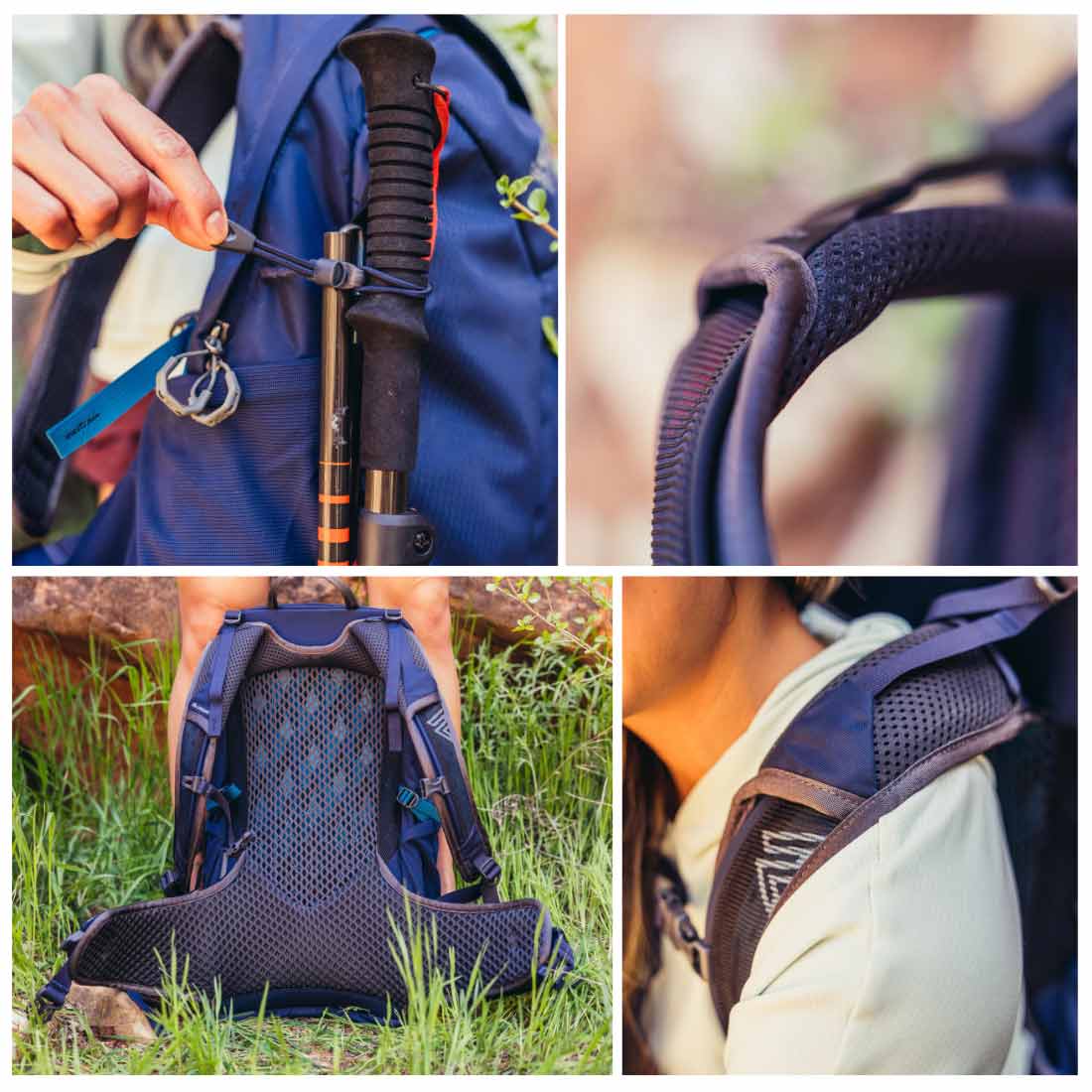Damski plecak turystyczny Gregory Jade LT 20 posiada także bardzo miękkie szelki. Mają one gładką powierzchnię, pokrytą oddychającą siateczką. Dzięki temu zapewniają komfort termiczny i nie powodują nieprzyjemnych otarć. Na szelkach znajduje się miejsce do przyczepienia ustnika bukłaka oraz zaczep na okulary przeciwsłoneczne. Nie zabrakło też oczywiście pasa piersiowego z gwizdkiem alarmowym.