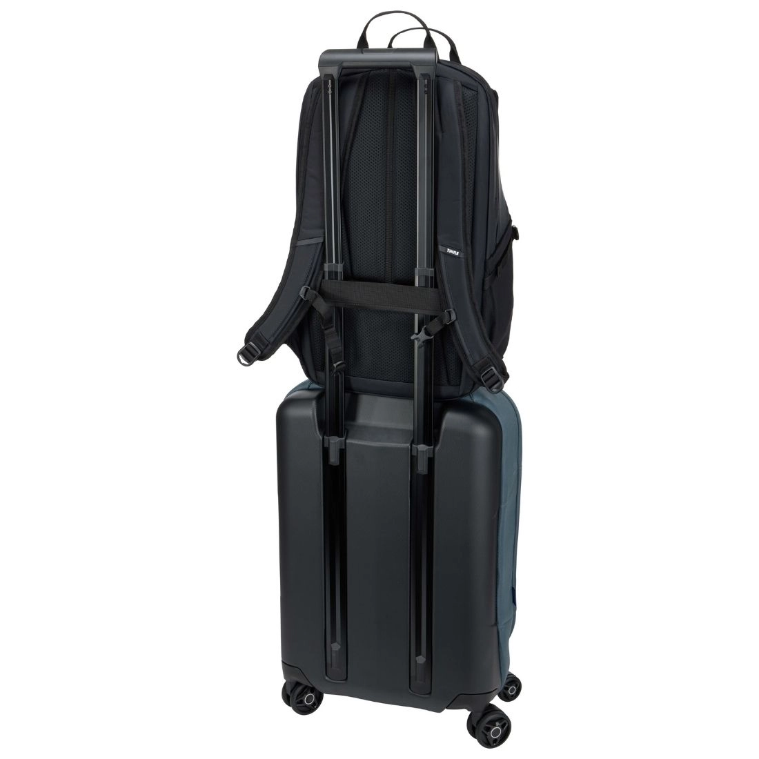 Dodatkowo na przednim panelu umieszczone zostały punkty mocowania umożliwiające łatwe doczepienie dodatkowego sprzętu. Na panelu tylnym jest również pas przewlekający do zaminowania plecaka przy walizce na kółkach. Dzięki temu plecak Thule EnRoute 26L pasować będzie np. do walizki podróżnej.