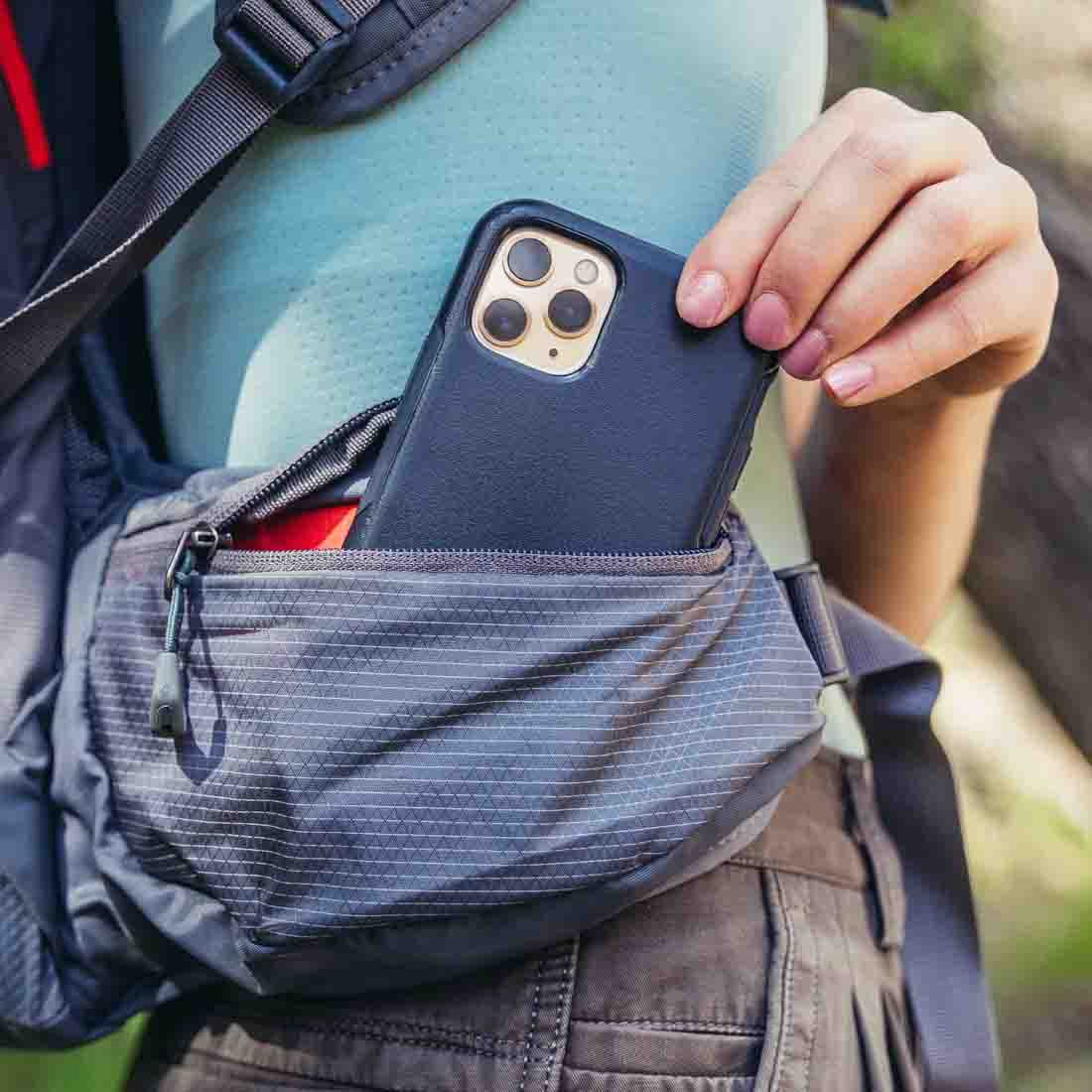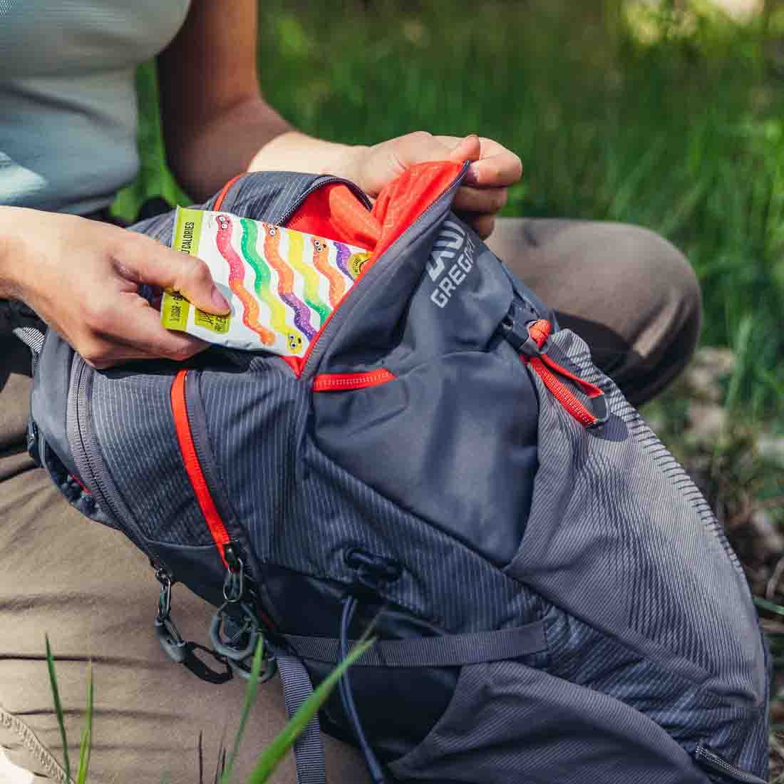 Z przodu Gregory Maya 25 ma elastyczną kieszeń zamykaną klamrą. Do środka możesz swobodnie włożyć ubrania, czapkę i inne przydatne przedmioty. Na bardziej delikatne gadżety, jak np. okulary przeciwsłoneczne lub elektronikę, jest oddzielna, mniejsza kieszeń na froncie plecaka. Okulary przeciwsłoneczne możesz również zaczepić na pasie naramiennym. Po bokach plecak ma kolejne dwie elastyczne kieszenie. Włożysz do nich butelkę z wodą lub bidon. Kieszenie znajdziesz także na pasie biodrowym. Są wystarczająco pojemne, żeby pomieścić telefon i przedmioty niezbędne podczas wędrówki.