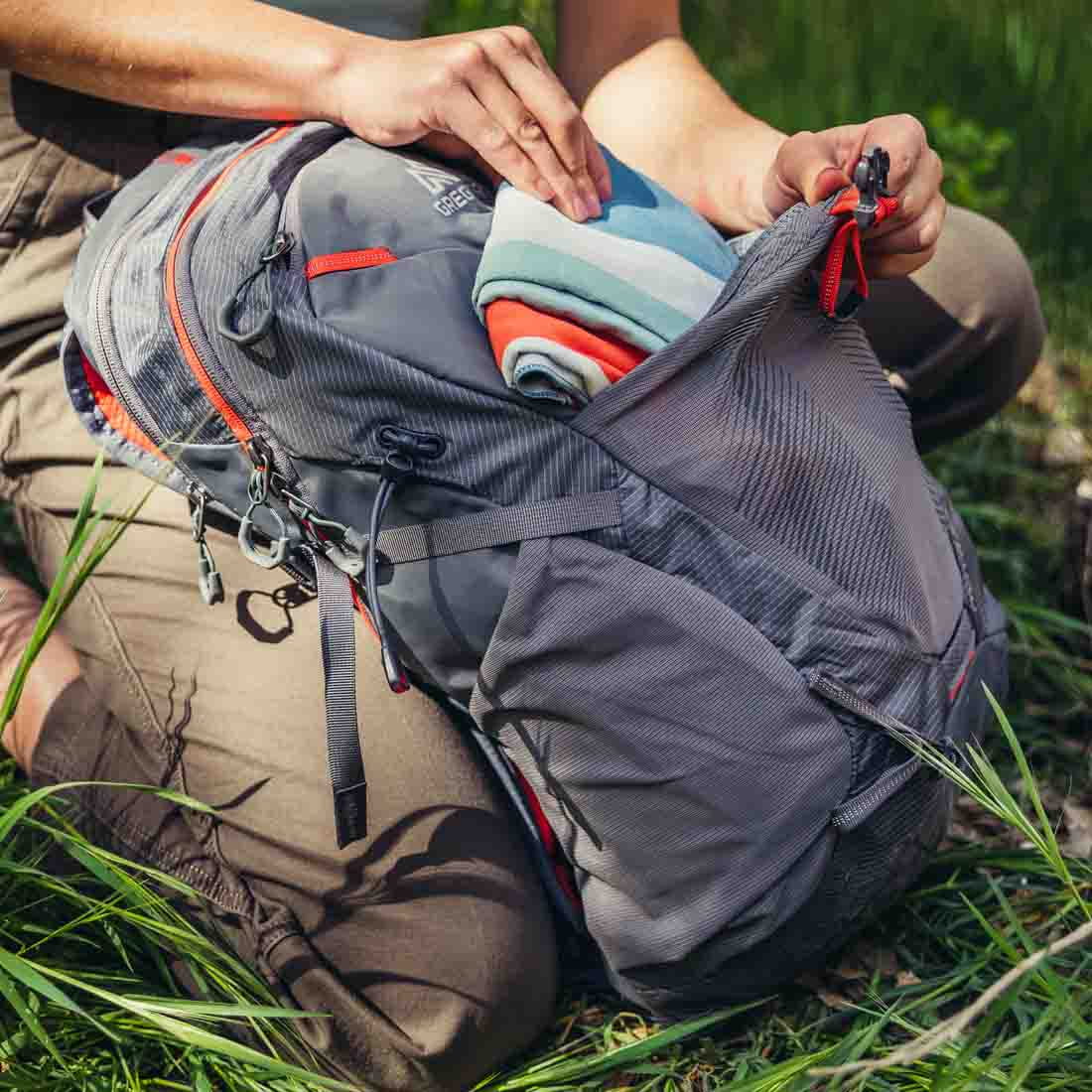 Plecak Gregory Maya 25 posiada pojemną komorę główną zamykaną na zamek błyskawiczny z wygodnym uchwytem ComfortGrip. Wewnątrz nie ma zbędnych kieszeni i przegród. Znajdziesz jedynie nieduży, przydatny organizer z siatki. Taka organizacja komory głównej daje Ci więcej swobody przy pakowaniu. A co z miejscem na bukłak? Jest na to oddzielna, zamykana przegroda z systemem mocowania SpeedClip. Ustnik bukłaka można zamontować na jednym z pasów naramiennych. Przegroda ta może służyć również jako „mokra kieszeń” na zabrudzone lub wilgotne ubrania.