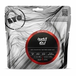 Liofilizowane danie wegańskie Lyofood Lentil Dal to indyjska potrawka soczewicowa z pomidorami i kaszą jaglaną. Charakteryzuje się kremową konsystencją i znakomitym aromatem. W potrawie tej czerwona soczewica ugotowana została w kokosowo-pomidorowym sosie i przyprawiona indyjskimi przyprawami. Jej charakter podkreśla chrupiąca, zielona soczewica oraz odrobina oliwy z oliwek. Podawana jest z bezglutenową kaszą jaglaną.