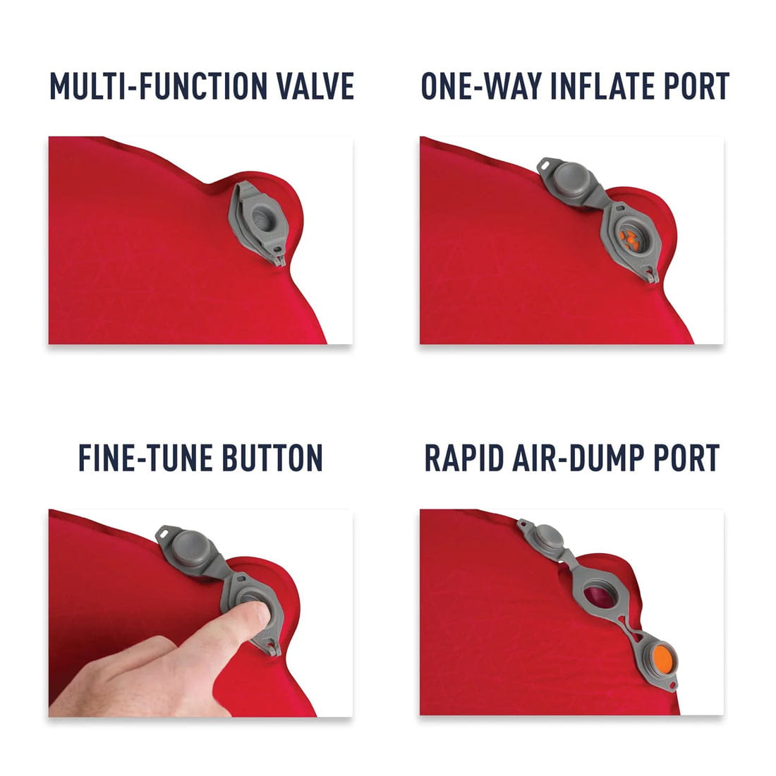 Szeroki, wielofunkcyjny zawór umożliwia szybkie napompowanie maty, a jednokierunkowy przepływ powietrza zabezpiecza przed stratami w przypadku niekontrolowanego rozszczelnienia zaworu. Po odwróceniu zaworu zapobiega on zasysaniu powietrza, dzięki czemu składania maty jest prostsze, zajmuje mniej czasu i pozwala maksymalnie ją skompresować. Opatentowany Multi Function Valve jest znacznie bardziej wydajny niż tradycyjne zawory śrubowe, zapewnia szybsze napełnianie i łatwiejsze spuszczanie powietrza z maty.