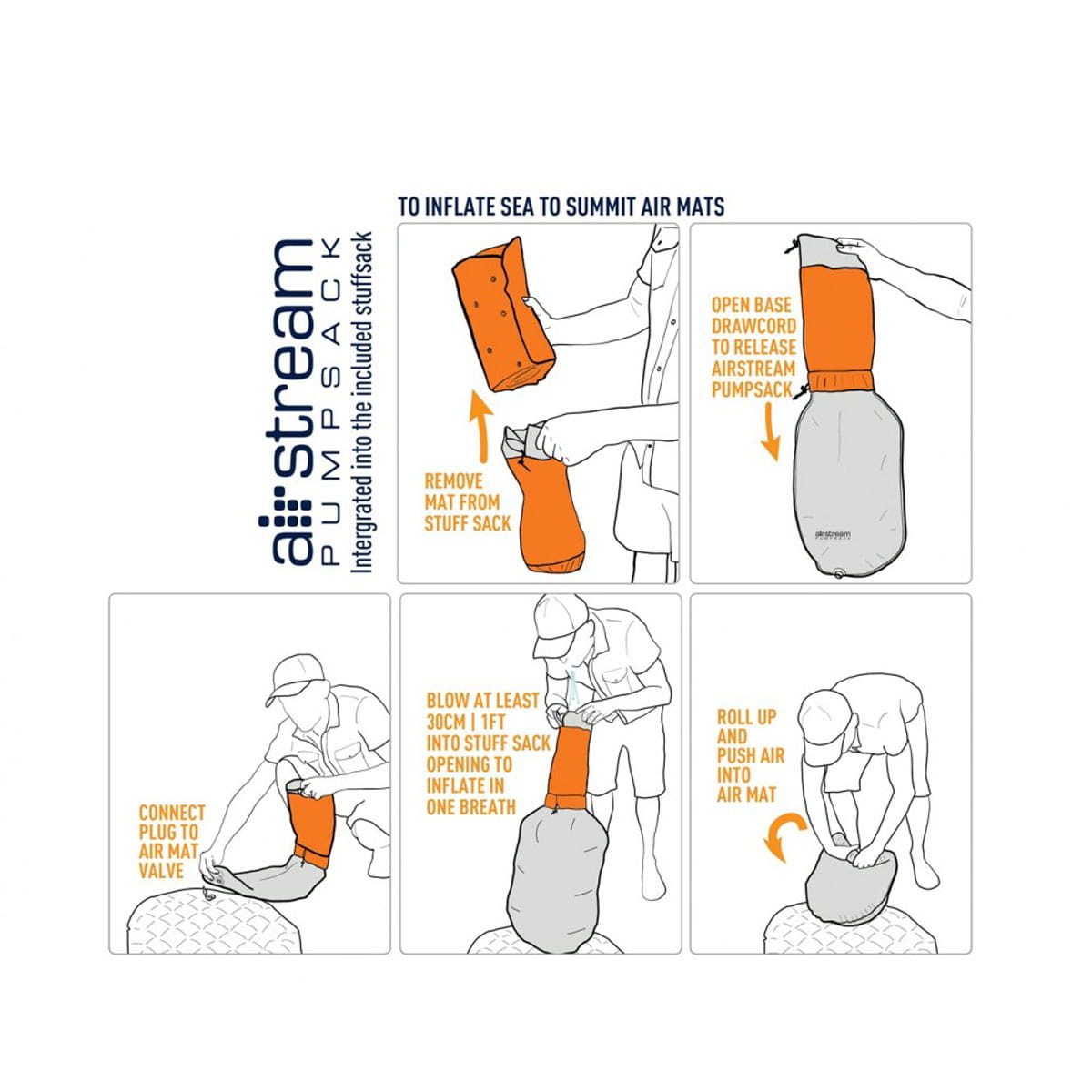 Worek Airstream ™ można napompować za pomocą jednego oddechu i wystarczy dwa lub trzy cykle, aby wypełnić większość mat Sea to summit. Jest nie tylko szybszy od pompowania ustamj, ale także minimalizuje kondensację oddechu i eliminuje zawroty głowy.
