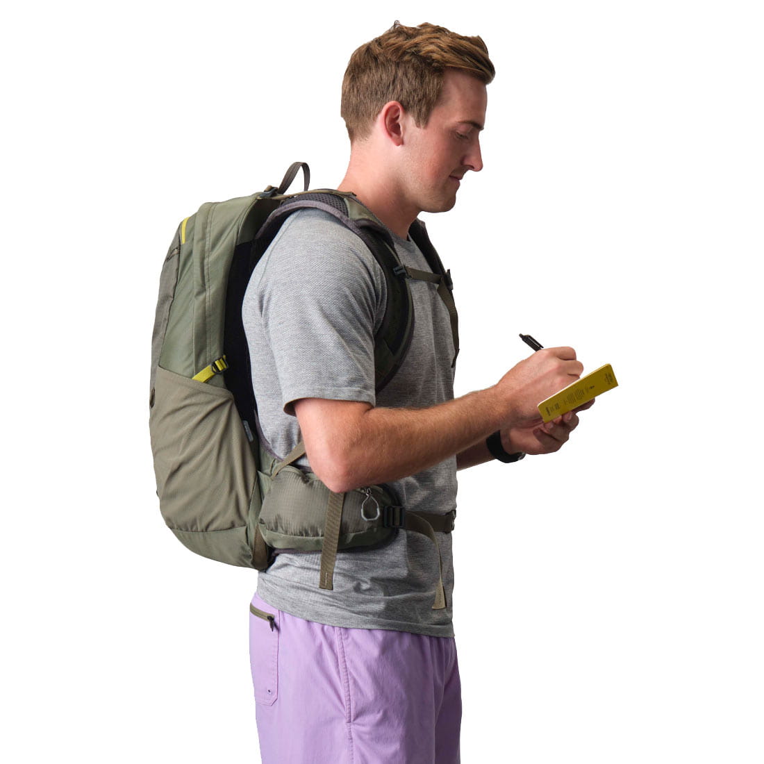 Dodatkowo męski plecak turystyczny Gregory Zulu LT 20 posiada jedną, niedużą kieszeń na froncie plecaka. Zmieszczą się tam klucze, telefon i pokrowiec przeciwdeszczowy. Po bokach plecaka znajdują się dwie obszerne elastyczne kieszenie, w które z łatwością zmieści się bidon, kubek termiczny lub butelka z wodą. Dodatkowo ich zawartość można zabezpieczyć paskami kompresyjnymi.
