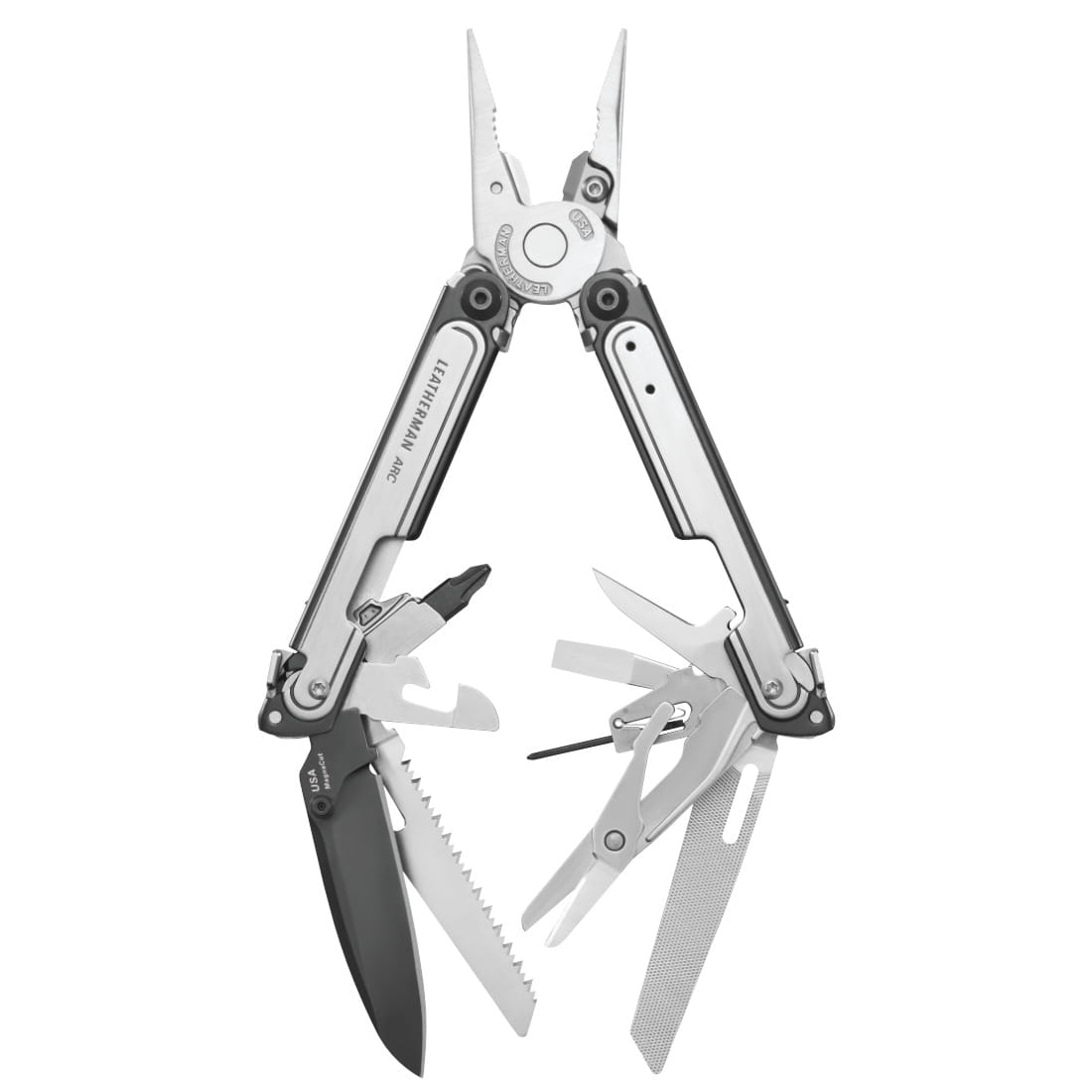 Leatherman ARC posiada korpus wykonany z wysokiej jakości stali nierdzewnej, w wersji Black DLC & Stainless Steel dodatkowo zabezpieczony twardą, odporną na zarysowania i korozję powłoką DLC. Został zbudowany w technologii FREE® wykorzystującej magnesy, które w znacznym stopniu zmniejszają tarcie w trakcie otwierania i zamykania narzędzi, mają również wpływ na mniejsze zużycie elementów i części multitoola. Wyposażony został zestaw 20 narzędzi, a technologia FREE® umożliwia otwieranie i zamykanie każdego z nich łącznie z kombinerkami za pomocą jednej ręki. ARC jest pierwszym modelem w którym do produkcji ostrza użyto stali CMP MagnaCut. Jest to wysokiej jakości stal zaprojektowana specjalnie do produkcji noży, cechująca się wysoką wytrzymałością mechaniczną, odpornością na korozję i bardzo dobrym trzymaniem ostrości. Ostrze wyposażone w kołek ułatwiający otwieranie dodatkowo zabezpieczono powłoką DLC. Jest również pierwszym multitoolem stworzonym na platformie FREE® posiadającym gniazda bitów Leatherman. Dwa gniazda do wymiennych, dwustronnych bitów, jedno standardowe i jedno do końcówek wkrętów precyzyjnych znacznie rozszerzają funkcjonalność i możliwości przystosowania do własnych potrzeb i wykonywanych prac. Duże kombinerki posiadają wymienne przecinaki do drutu i umożliwiają wykonywanie szerokiego zakresu prac. Na uwagę zasługują piła i sprężynujące nożyczki, oraz wielofunkcyjny pilnik umożliwiający obróbkę różnych materiałów. W zestawie wraz z multitoolem użytkownik otrzymuje dwa bity: standardowy i precyzyjny.