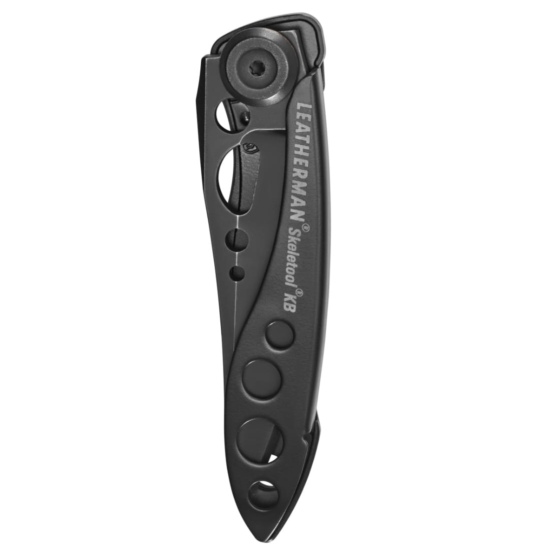 Leatherman Skeletool KB posiada korpus wykonany z połączenia wysokiej jakości stali nierdzewnej i aluminium 6061-T6. Rękojeść dodatkowo została zabezpieczona twardą, odporną na zarysowania powłoką Cerakote™. Ostrze gładkie ze stali 420HC i długości 6,6 cm sprawdzi się podczas cięcia bardziej precyzyjnego, krojenia, itp. Ostrze posiada wycięcie na kciuk umożliwiające otwieranie noża jedną ręką. Blokada bezpieczeństwa typu LINER-LOCK zapobiega przypadkowemu złożeniu się ostrza, co znacznie poprawia bezpieczeństwo użytkownika. Demontowany, sprężysty klips umożliwiający przypięcie noża do paska lub krawędzi kieszeni. Dzięki specjalnie zaprojektowanemu kształtowi klips może służy jednocześnie jako otwieracz do butelek.