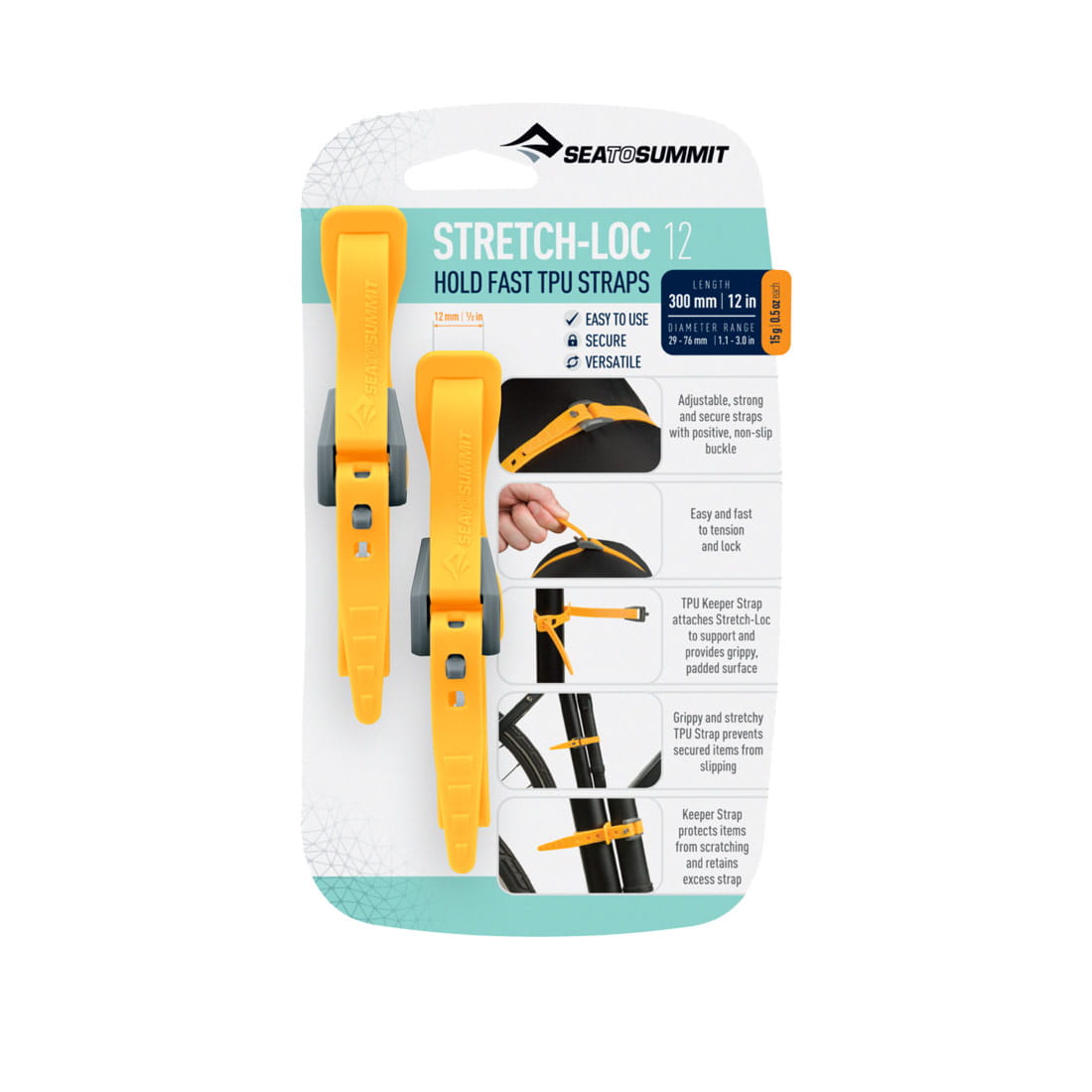 Sea To Summit Stretch-Loc 12 to zestaw dwóch pasów mocujących wykonanych z wytrzymałego i elastycznego termoutwardzalnego poliuretanu (TPU). Materiał ten nie tylko zapewnia trwałość pasów mocujących, ale też zapobiega ich ślizganiu się po zabezpieczanej powierzchni.
