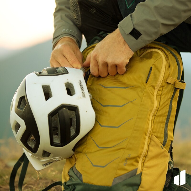 Plecak posiada również pasy, które służą do zamocowania kasku po zewnętrznej stronie komory. Z powodzeniem można je wykorzystać do wszelkiego rodzaju kasków rowerowych – również tych pełnotwarzowych. Na uwagę zasługuje także specjalna kieszonka na telefon. Została ona zlokalizowana w takim miejscu, by rowerzysta mógł zawsze trzymać swój smartfon w zasięgu ręki. Wygodna konstrukcja kieszonki zapewnia łatwego dostępu do telefonu, a jednocześnie zabezpiecza go przed wypadnięciem z plecaka. Deuter Flyt posiada także dodatkowe pasy służące do podpięcia do plecaka, aż 2 bukłaków jednocześnie!