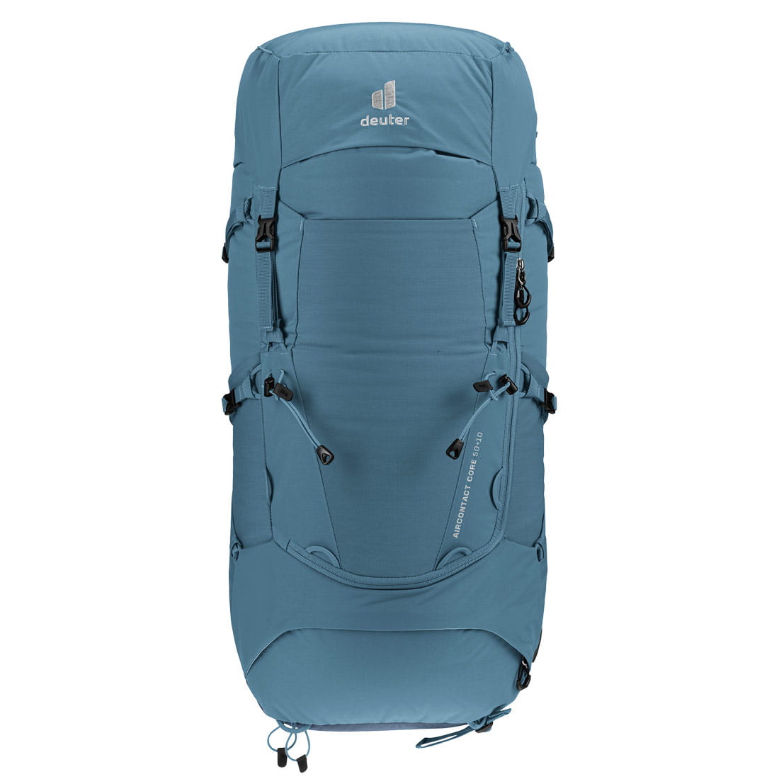 Deuter Aircontact Core 50+10 to dwukomorowa konstrukcja o pojemności 50 litrów, którą dzięki ekspanderowi w kominie można powiększyć o 10 litrów. Główna komora ma klasyczny dostęp od góry zabezpieczony za pomocą klapy, oraz od frontu dzięki zamkowi błyskawicznemu. W jej wnętrzu znajduje się oddzielna przegroda przeznaczona na bukłak lub mokrą odzież (bukłak sprzedawany oddzielnie). Dolna komora jest odpowiedniej wielkości aby pomieścić w niej śpiwór. Komory są rozdzielone przeponą na suwak umożliwiającą ich połączenie i stworzenie jednej dużej przestrzeni załadunkowej, co może być przydatne podczas transportu dłuższych lub gabarytowych przedmiotów. Klapa zabezpieczająca komorę górną posiada zewnętrzną kieszeń na zamek błyskawiczny, w której znajduje się pokrowiec przeciwdeszczowy i klip na klucze. Po wewnętrznej stronie klapy nadrukowano panel z instrukcją SOS. Od frontu plecak posiada obszerną kieszeń elastyczną, pętle do przytroczenia czekana i kijów trekkingowych i szlufki do troczenia dodatkowych akcesoriów. Dwie boczne kieszenie elastyczne bez problemu pomieszczą butelkę z wodą lub duży termos. Dwie kieszenie na pasie biodrowy zapinane na suwak zapewniają dodatkowe miejsca do przechowywania drobnych akcesoriów podręcznych. Na prawej płetwie pasa biodrowego znajduje się również kieszeń na bidon. Cztery boczne pasy służą do kompresji, dzięki modułowej konstrukcji mogą być odpięte i wykorzystane do troczenia dodatkowego wyposażenia (np. maty lub namiotu) w dolnej części plecaka.