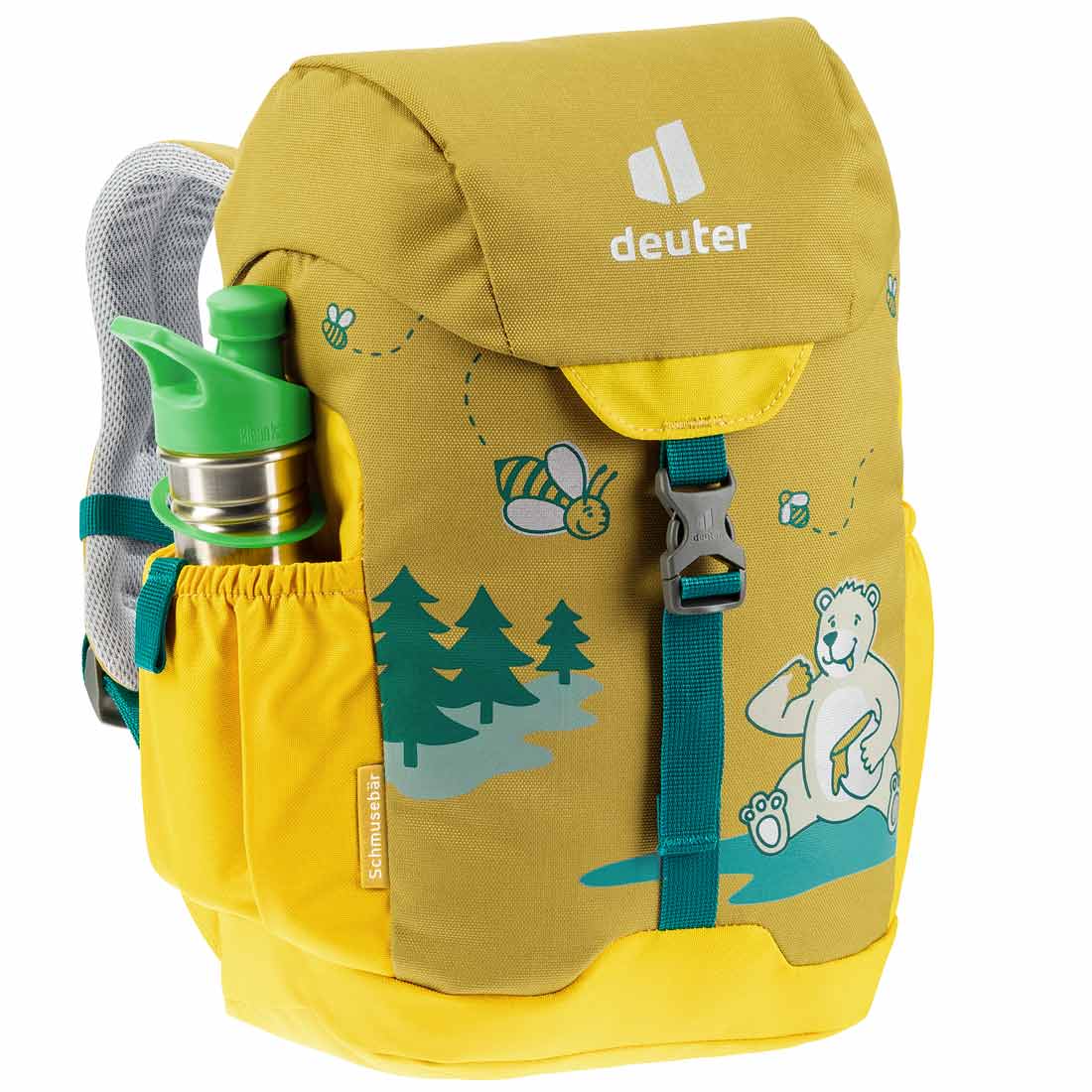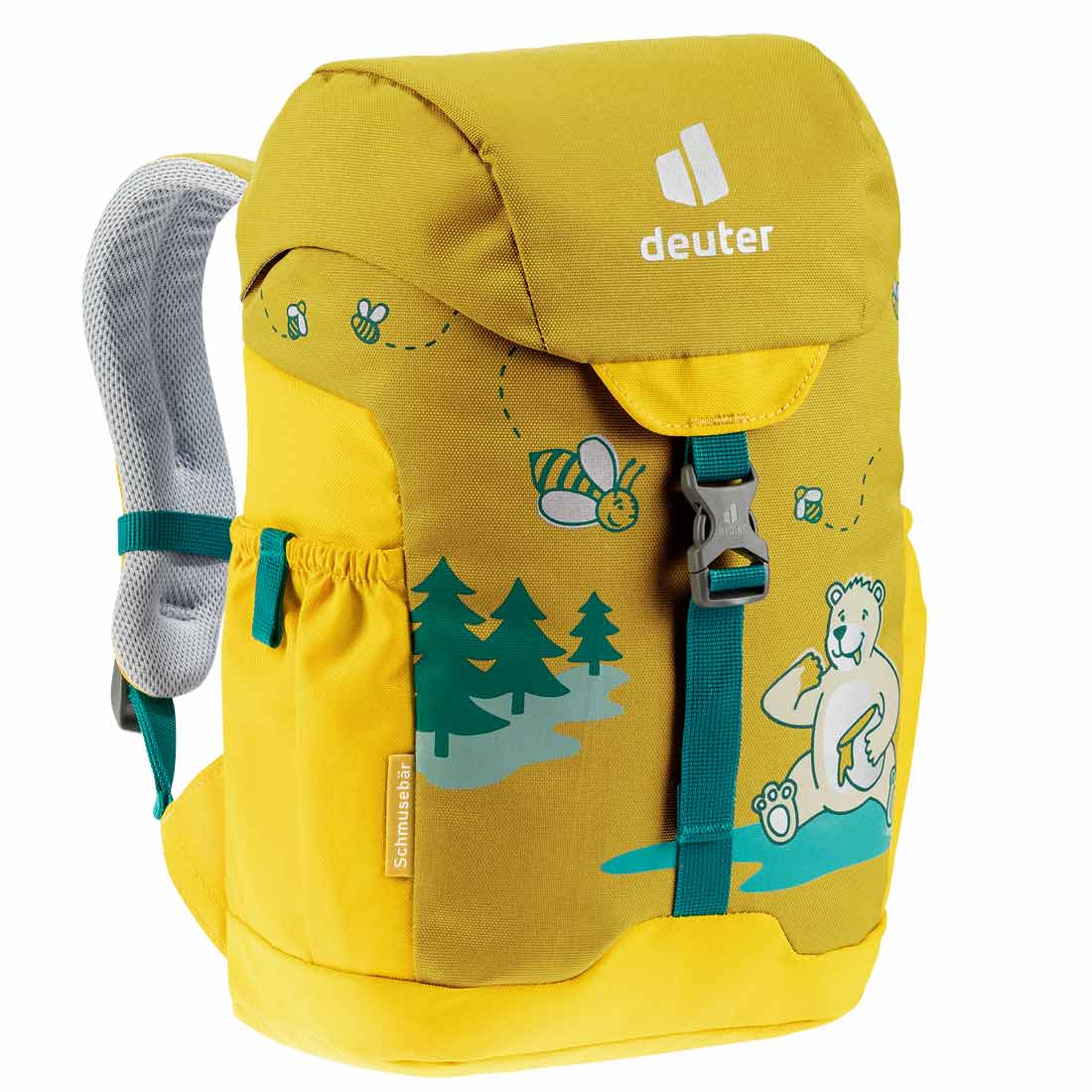 Deuter Schmusebär to profesjonalny plecak dla małego podróżnika. Skonstruowany tak by każdy maluch w wieku od 3 lat mógł samodzielnie z niego korzystać. Plecak posiada zapięcie z klamrą skonstruowaną specjalnie z myślą o dzieciach. Komora główna zaciągana jest linką i zapinana z zewnątrz za pomocą klamerki. Po wewnętrznej stronie klapy zamykającej komorę główną, znajduje się specjalne miejsce służące do umieszczenia danych dziecka. Dodatkowo plecaczek posiada zapinaną na suwak kieszeń na klapie. Po bokach plecaka umieszczono dwie dodatkowe kieszonki idealne na bidon i drobne akcesoria. Pasy nośne plecaczka, wyprofilowano i uszyto z materiału nie powodującego obtarć. Tył został wyprofilowany i wypełniony miękką oddychająca pianką, która również zabezpiecza plecy dziecka podczas noszenia kanciastych przedmiotów. Elementy odblaskowe na froncie i szelkach plecaczka poprawiają bezpieczeństwo w słabych warunkach oświetleniowych.