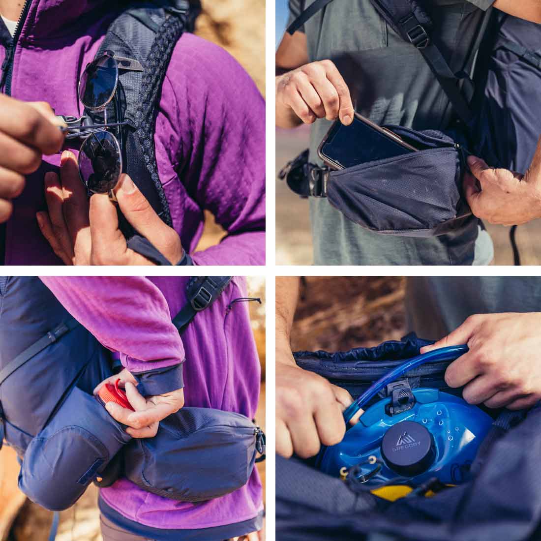 Gregory Baltoro 75 posiada dwie komory z możliwością ich połączenia, oraz trzy sposoby dostępu do spakowanego w plecaku wyposażenia. Pojemna komora górna wyposażona została w osobną kieszeń na bukłak, dostęp do jej wnętrza może być realizowany na dwa sposoby, klasycznie od góry poprzez klapę lub dodatkowe, zabezpieczone suwakiem dojście umieszczone od frontu plecaka. Dolna komora zamykana zamkiem błyskawicznym jest odpowiedniej wielkości aby pomieścić śpiwór. Liczne kieszenie i punkty służące do troczenia umożliwiają odpowiednie odpowiednie rozmieszczenie akcesoriów. Od frontu plecak znajdują się obszerna mokra kieszeń i dwie pojemne kieszenie zabezpieczone zamkami błyskawicznymi. Po bokach umieszczono z jednej strony kieszeń elastyczną, a z drugiej chowany uchwyt na bidon i dwie szlufki do troczenia. Dodatkowe dwie kieszenie na pasie biodrowym zapewniają miejsce na drobne akcesoria podręczne. Posiada trzy kieszenie w klapie, dwie zewnętrzne i jedną wewnętrzną, w niej umieszczono pokrowiec przeciwdeszczowy. Znajdujące się w dolnej części plecaka paski z klamrami umożliwiają troczenie dodatkowych akcesoriów, np. karimaty. Plecak wyposażono w pętle do mocowania czekanów i kijów trekingowych.
