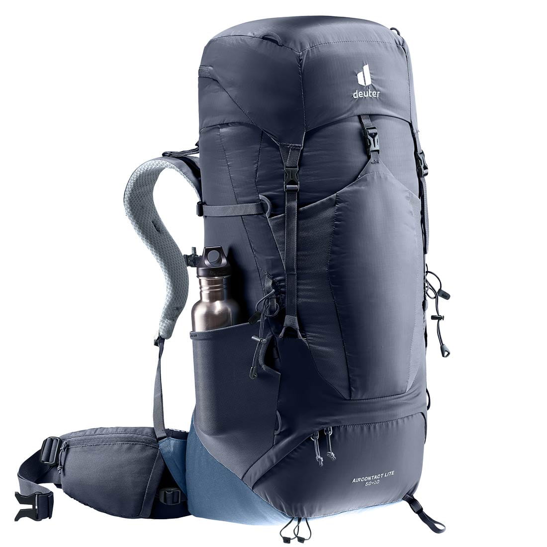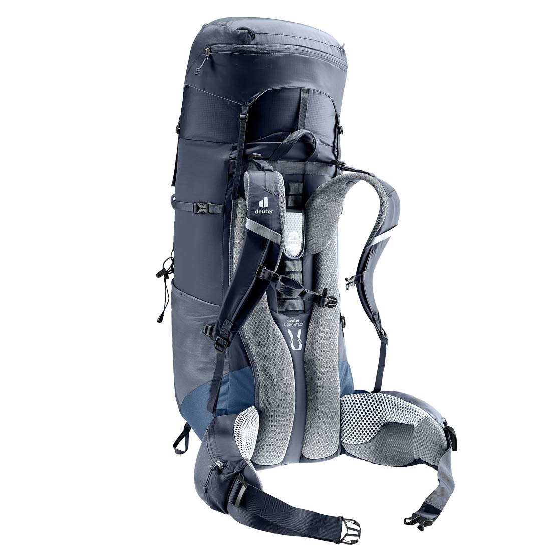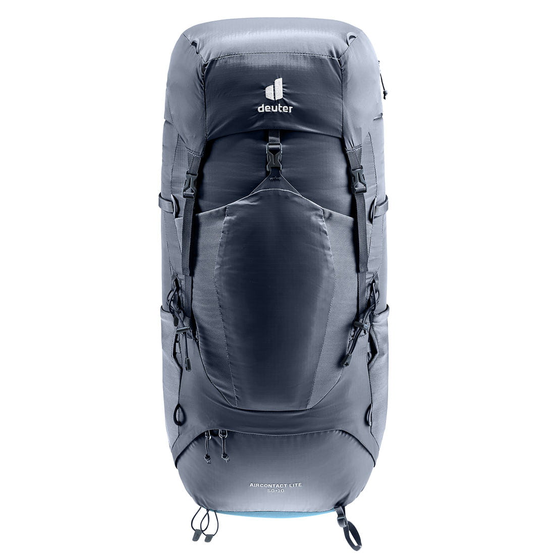 Deuter Aircontact Lite 50+10 posiada regulowany system nośny Aircontact Lite będący połączeniem niskiej wagi i wysokiego komfortu. Vari-Quick umożliwia precyzyjną regulację i dopasowanie długości systemu nośnego do wzrostu i budowy użytkownika. Anatomicznie uformowane pasy nośne w kształcie „S” pokryte z zewnątrz tkaniną 3D-AirMesh dla poprawienia wentylacji. Ta sama tkanina została użyta na poduszkach panelu tylnego, pomiędzy nimi znajduje się centralny kanał wentylacyjny poprawiający cyrkulację powietrza. Do usztywnienia panelu tylnego wykorzystano anatomicznie uformowane szyny aluminiowe, ułożone w kształcie litery X, co pozwala na lepsze dopasowanie systemu nośnego do pleców, lepszy balans ciężaru i przeniesienie go na pas biodrowy. Pas biodrowy w systemie ECL (Ergonomic Comfort Lock) został wyposażony w dodatkowe poduchy które umożliwiają lepsze przyleganie oraz lepsze przenoszenie ciężaru, zastosowano system zapięcia pasa biodrowego poprzez ściągnięcie troków przed sobą, taki mechanizm wymaga od użytkowniczki/użytkownika zdecydowanie mniej siły oraz zdecydowanie poprawia precyzję jego dopasowania.