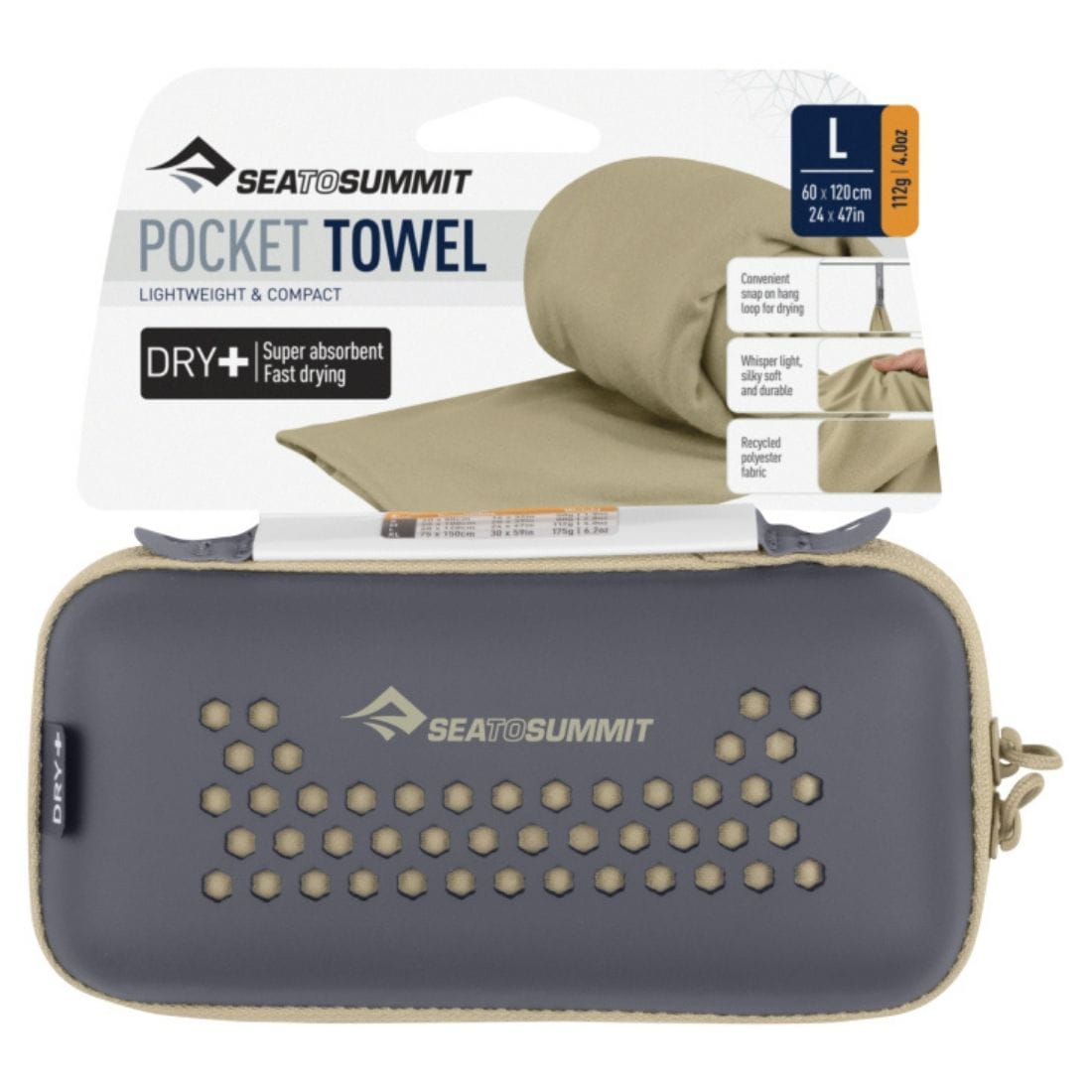 Sea To Summit Pocket Towel L to kompaktowy ręcznik turystyczny o wymiarach 60 x 120 cm. Wykonany jest z super chłonnej i szybkoschnącej mikrofibry. Do jego produkcji użyto poliestru pochodzącego z recyklingu. Wykorzystany materiał ma przyjemną w dotyku i delikatną dla skóry fakturę przypominającą ręczniki frote. Ręcznik wykonano przy użyciu technologii DRY+. Jego tkanina jest bardzo chłonna. Ręcznik może absorbować 3 razy więcej wody niż sam waży. Natomiast jego wysokie właściwości szybkoschnące zapobiegają zatrzymywaniu wilgoci. Dzięki temu jest bardziej higieniczny niż klasyczne ręczniki.