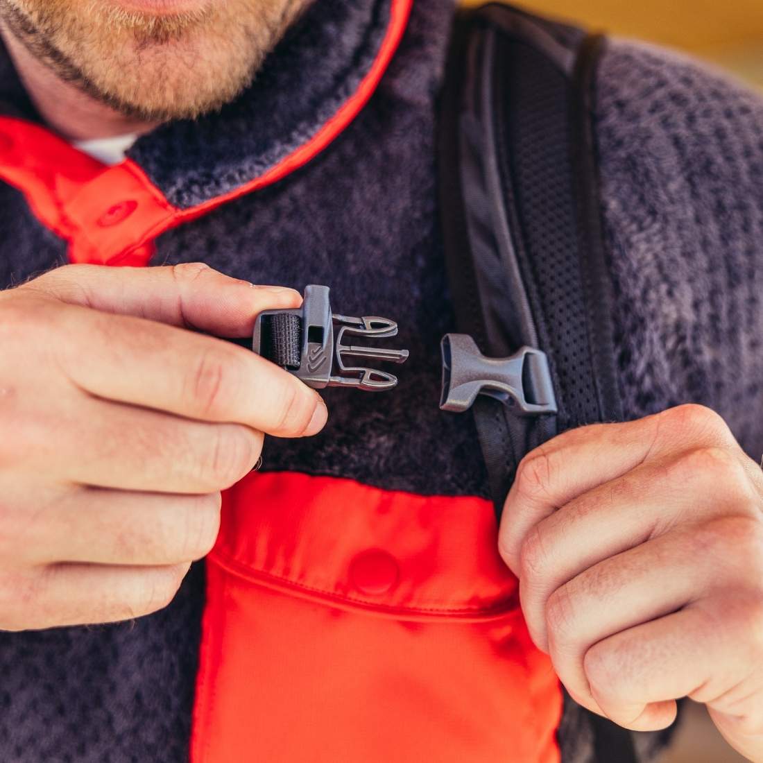 W plecaku Gregory Nano 16 panel tylny oraz szelki uprzęży wykonano z perforowanej pianki EVA, która została pokryta lekką siateczką. Taka budowa zapewnia odpowiedni poziom wentylacji i poprawia komfort noszenia. Na szelkach został umieszczony regulowany pas piersiowy z gwizdkiem oraz zaczep na okulary przeciwsłoneczne.