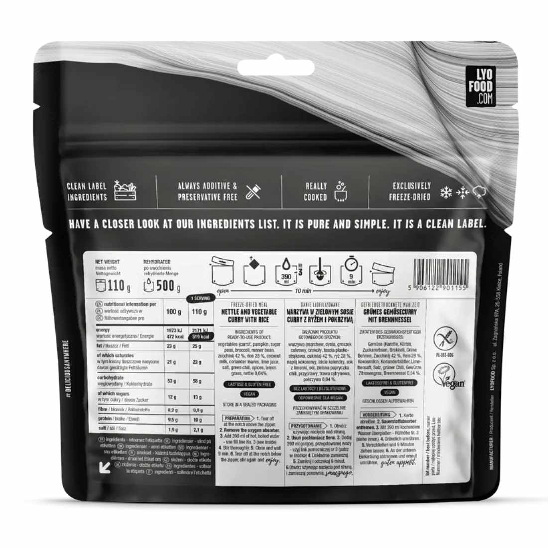 Liofilizowane danie wegańskie Lyofood Zielone curry z pokrzywą to ulubione danie światowej sławy wspinacza Sean'a Villanueva O'Driscoll. Składa się z mnóstwa zdrowych warzyw (marchwi, dyni, groszeku cukrowego, brokułów, fasoli płaskostrąkowej, cukinii) podanych z ryżem i polanych aromatycznym sosem. Sos skomponowany został na bazie mleka kokosowego z dodatkiem soku z limonki, kolendry, trawy cytrynowej i pokrzyw. W ten sposób powstał w pełni zbilansowany, bezglutenowy posiłek, który może zachwycić niejedno podniebienie.