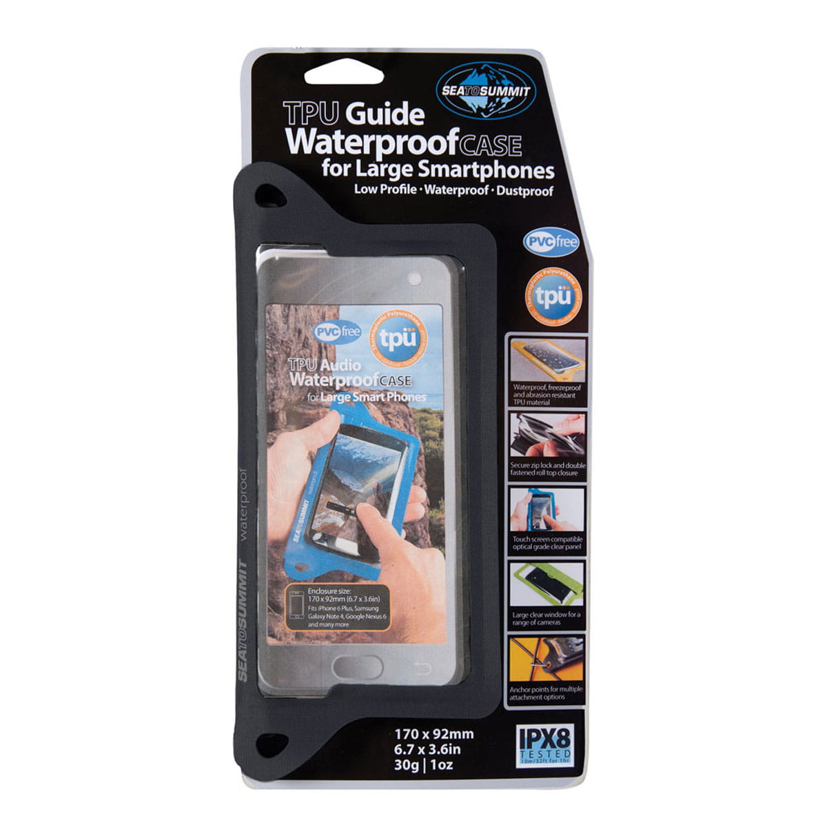 Wodoszczelny i ergonomiczny pokrowiec na duże smartfony TPU Guide Waterproof Case for Smartphone jest nieodzownym elementem wyposażenia turysty w każdych warunkach. Pokrowiec przystosowany jest do większości dużych smartfonów, np.: iPhone 6 plus, Samsung Galaxy Note 4 , Google Nexus 6P i wiele innych. Opakowanie wykonane w procesie zgrzewania Termoplastycznego Elastomeru Poliuretanowego (TPU) i zastosowanie zamknięcia Ziploc w połączeniu z dodatkowym trzykrotnie rolowanym zamknięciem na rzepy stwarza, iż miękkie opakowanie telefonu jest całkowicie wodoszczelne. Dzięki właściwościom TPU otrzymujemy produkt mocny, elastyczny, odporny na UV i doskonale zachowujący się w niskich temperaturach. Na obwodzie opakowania znajdują się wycięte otwory służące do mocowania.